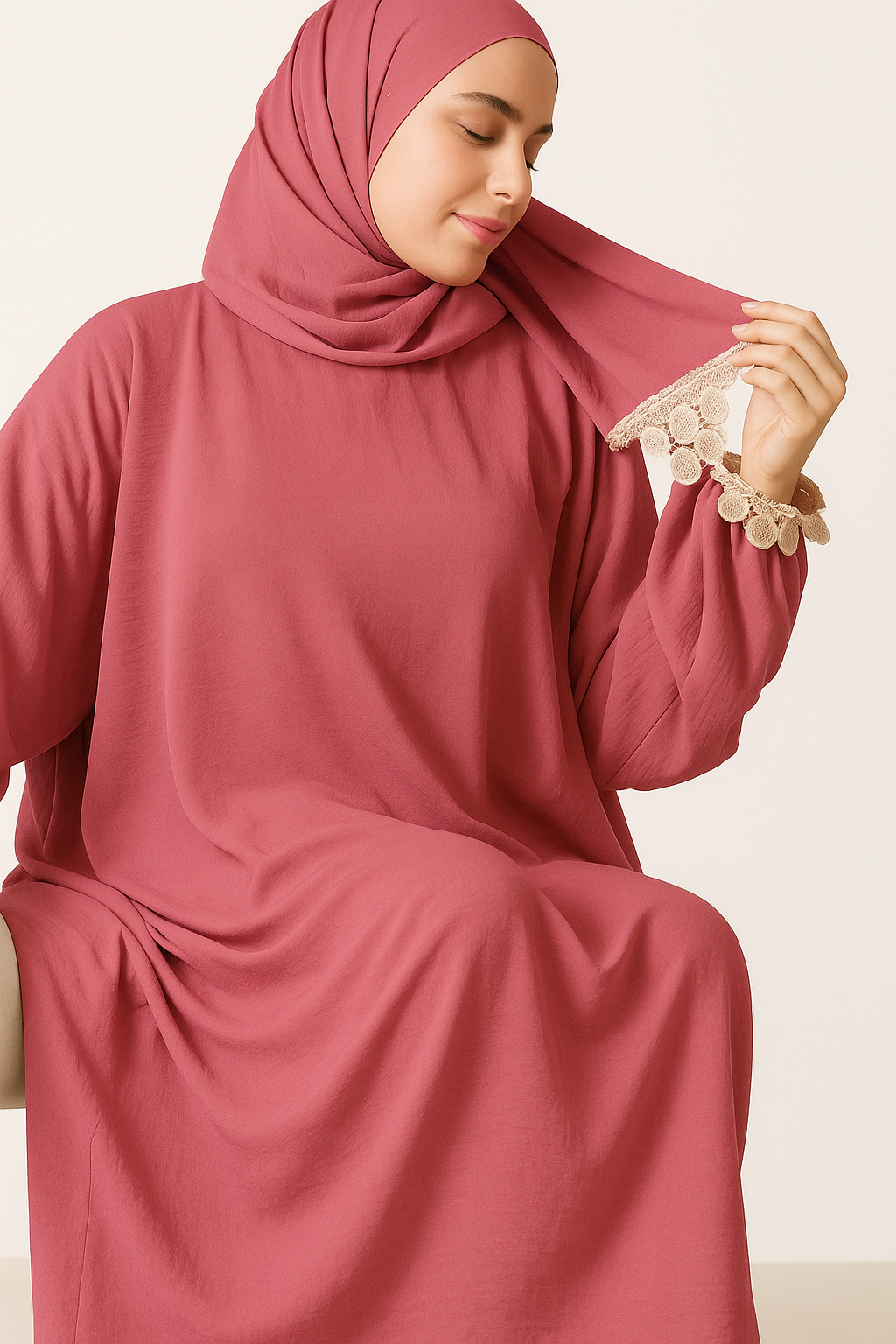 إسدال أنيق بخامة C.Y عالية الجودة، ناعم على البشرة ومناسب لكل الأوقات. التصميم فضفاض يمنح راحة وحرية حركة، مع لمسة أنوثة فاخرة بكلفة دانتيل فاتحة على الأكمام.