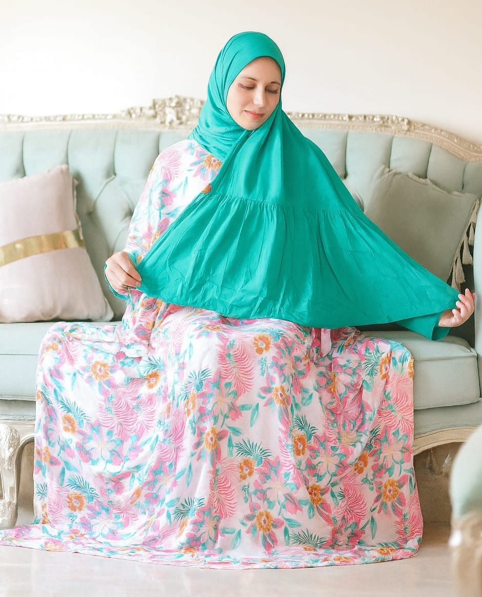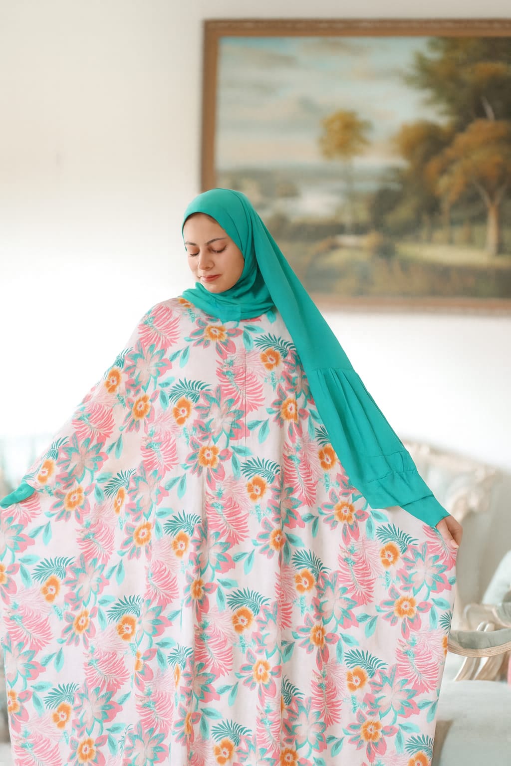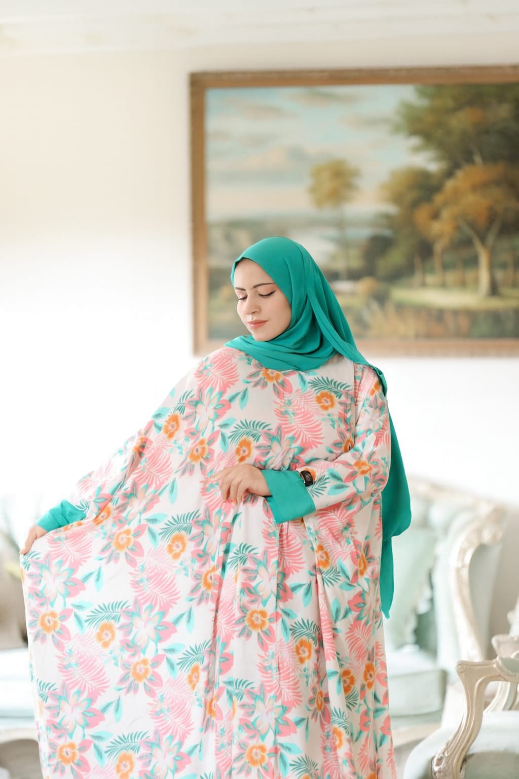 تصميمه مطبوع برسومات زهرية أنثوية بألوان مبهجة (بينك × تركواز × أصفر)، مع طرحه سادة باللون التركواز الهادئ لإطلالة أنيقة ومميزة.
